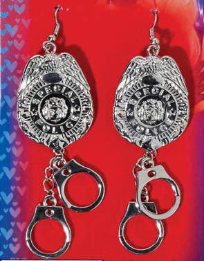 - Each earring features a silver coloured police badge with an eagle shape and engraved 'Special Police'. Dangling from each badge is a pair of cute silver coloured handcuffs.