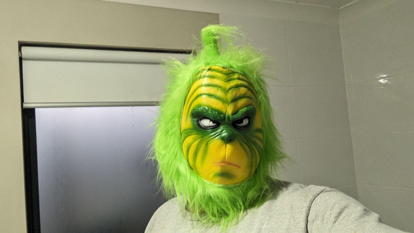 Deluxe Green Latex Christmas Stealer Mask with Faux Fur