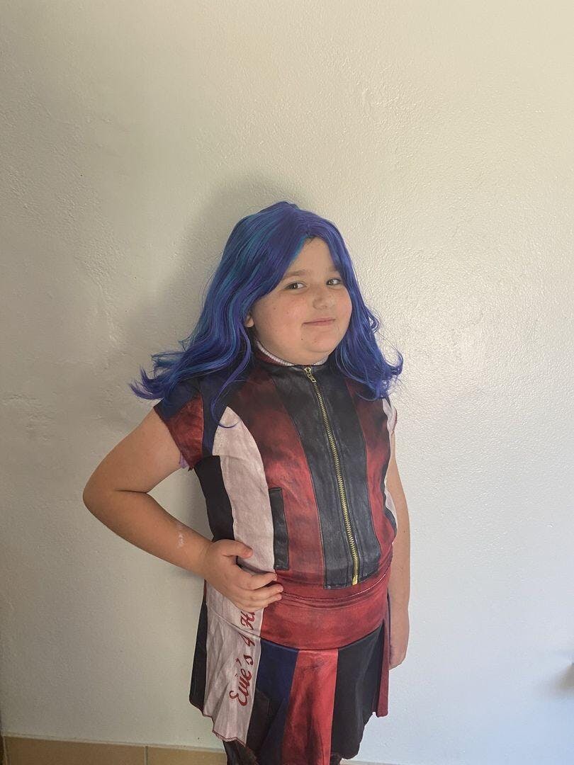 • Costume includes a separate matching pleated skirt to wear over the jumpsuit with elastic waistband and printed 'Evie's 4 Hearts'.